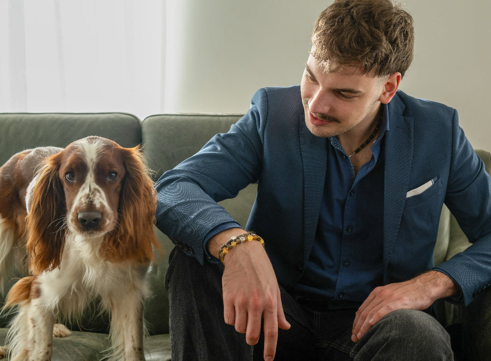 Close-up of a person wearing a beaded bracelet on their wrist with a blue shirt and dark jeans.