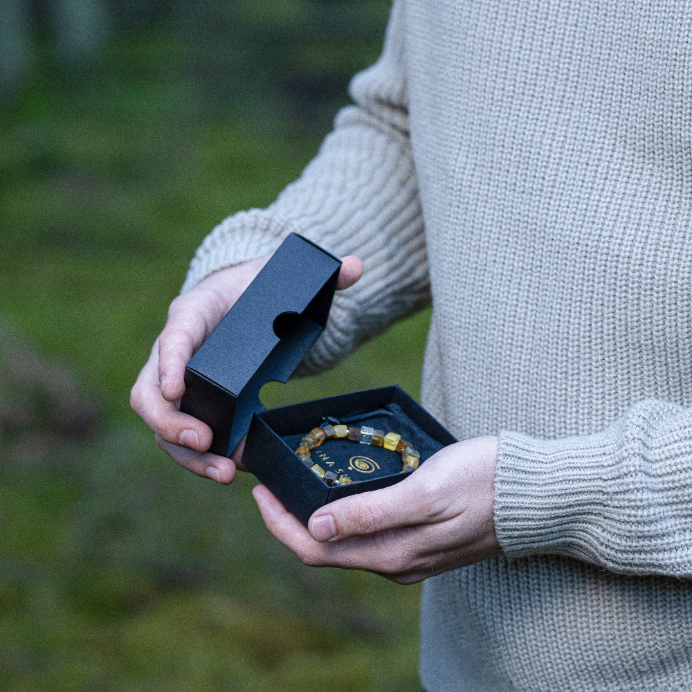 Apyrankė supakuota į dovanojimui tinkamą dėžutę, pridedamas gaminio pasas ir gintaro savybių aprašymas.