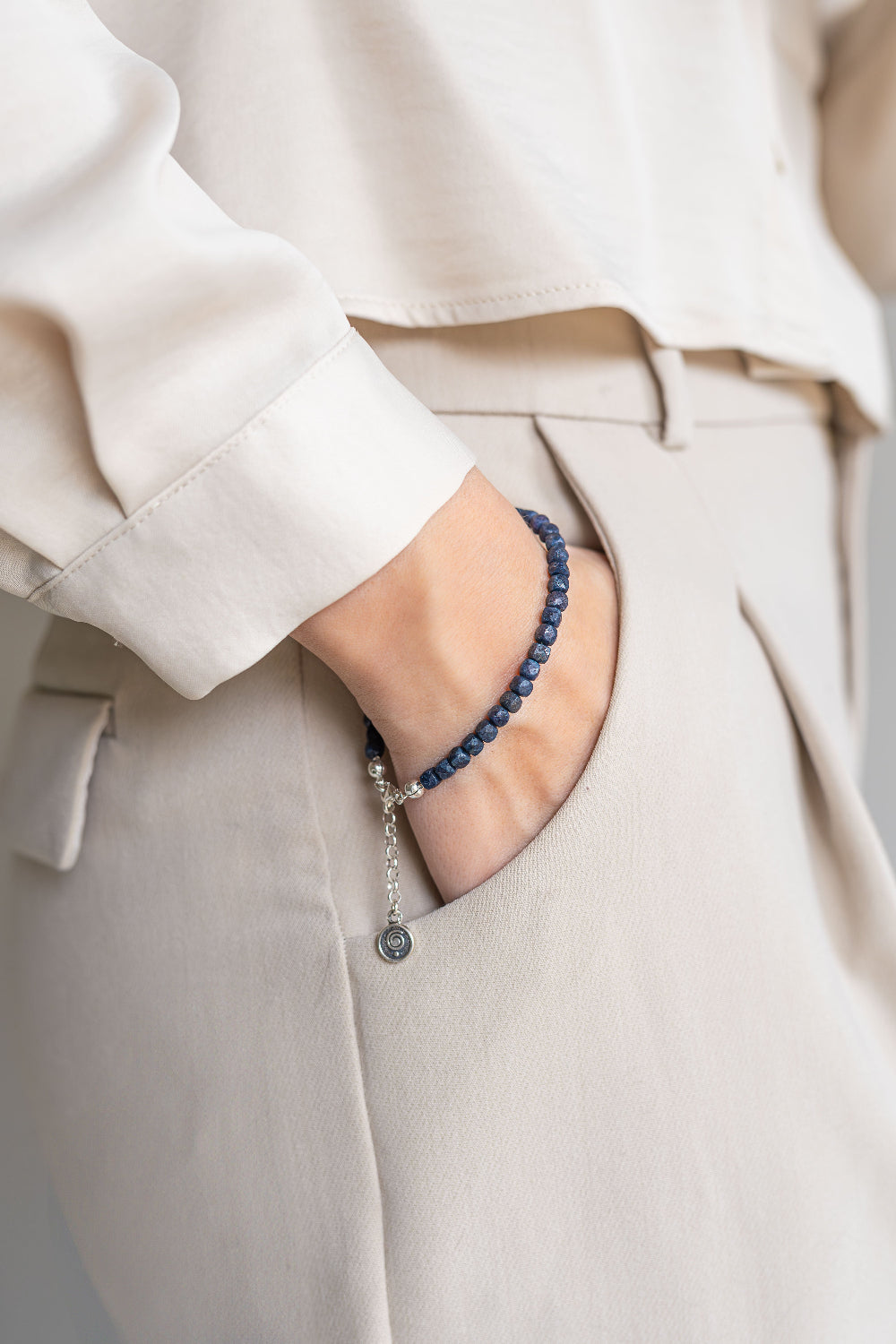 Kolje ir apyrankę puošia rankų darbo sidabro 925 medalikėlis paženklintas asmenybės augimą ir klestėjimą simbolizuojančia spirale.