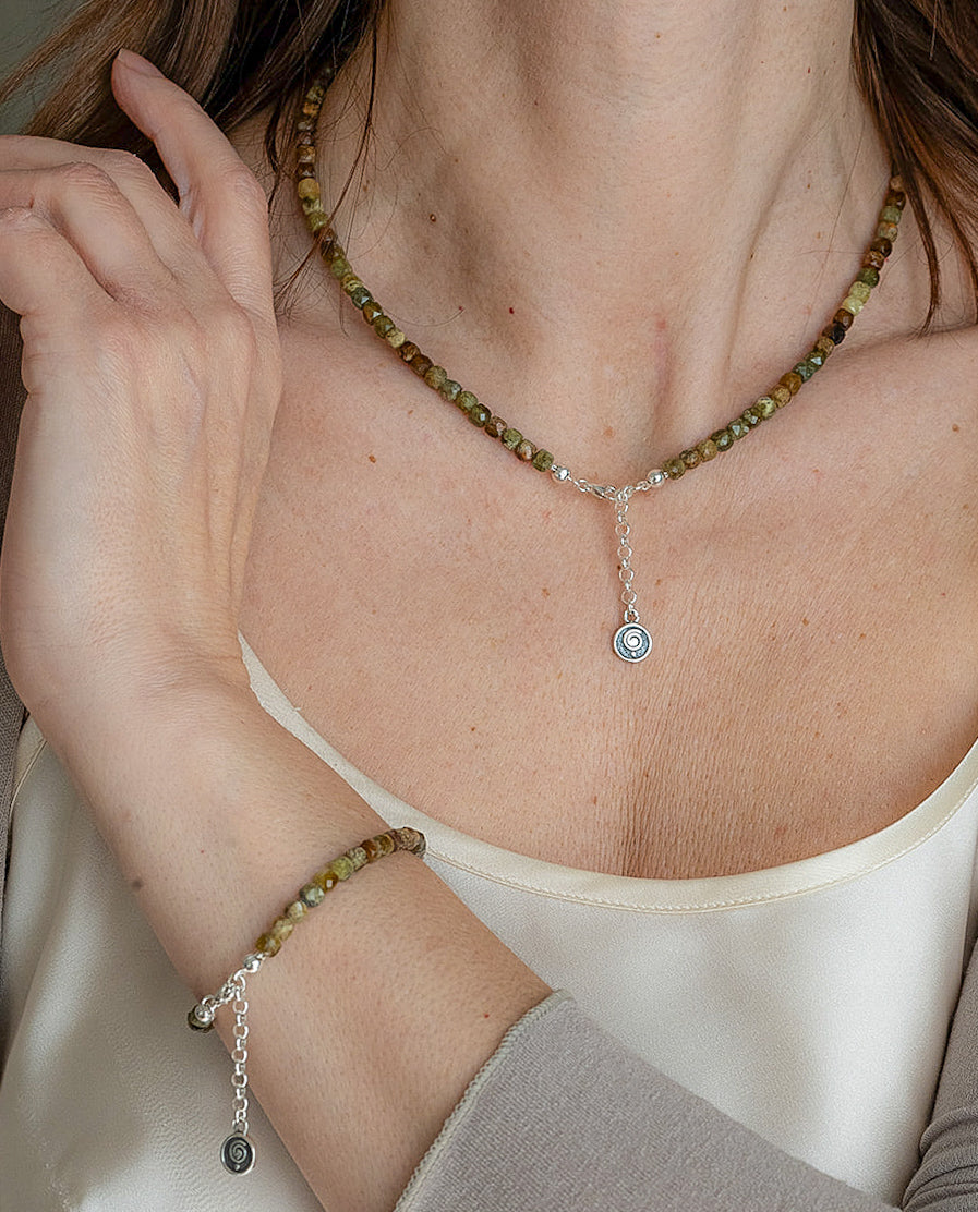 Vėrinį ir apyrankę puošia rankų darbo sidabro 925 medalikėlis "Laimė" paženklintas asmenybės augimą ir klestėjimą simbolizuojančia spirale.