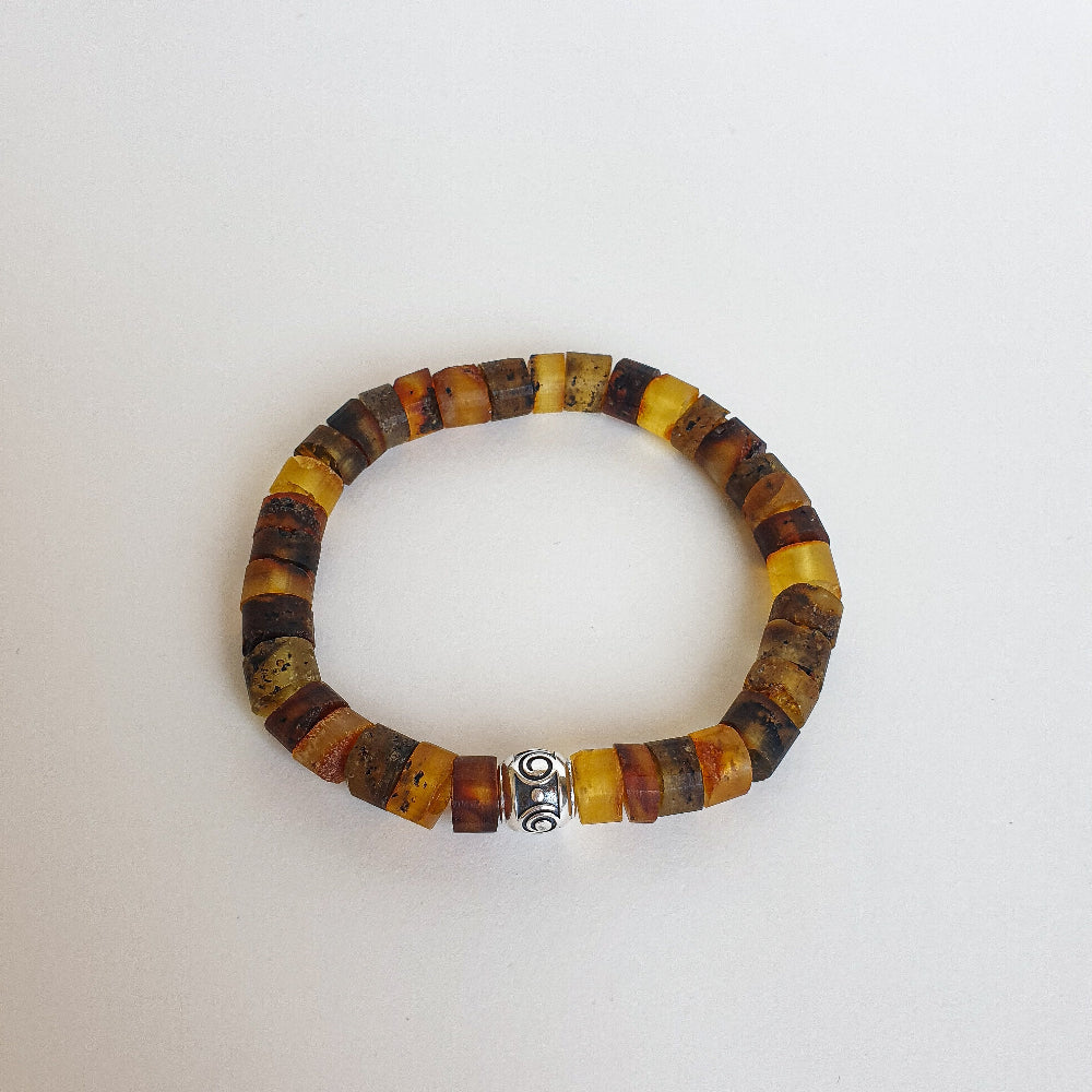 Bracelet for women with natural amber and silver 925. It has an accent handcrafted silver 925 bead with sign of Spiral representing prosperity and growth. Amber is not polished, irregular shape, diameter is 7,5 mm.