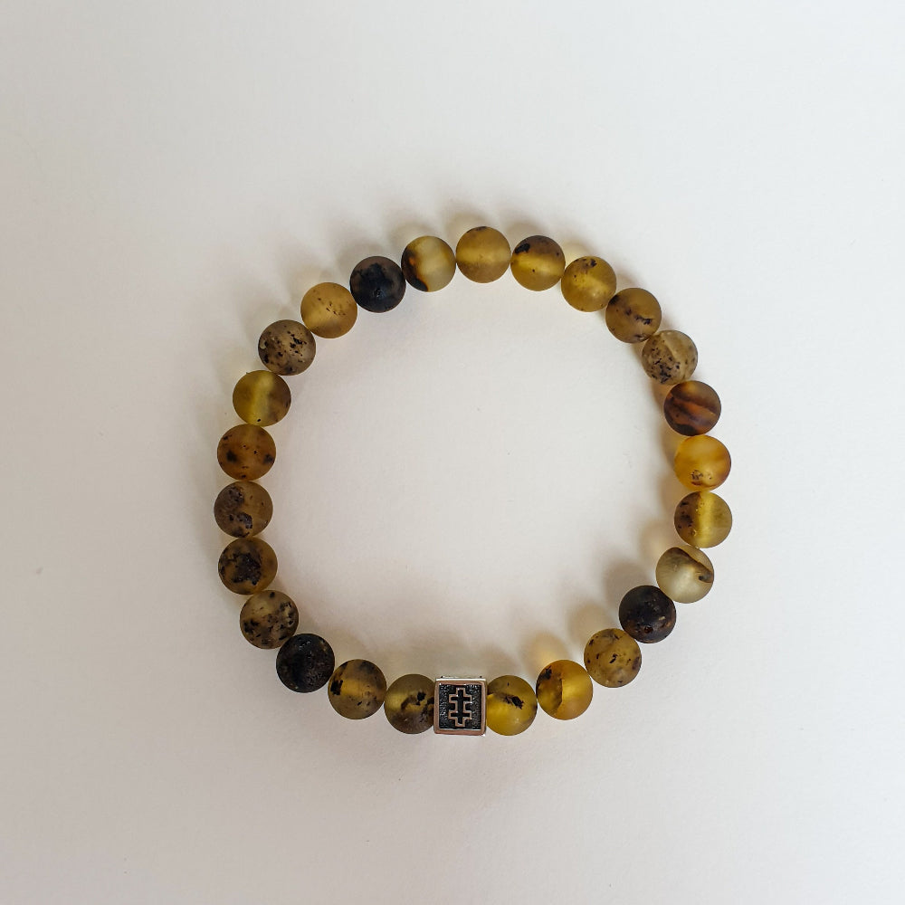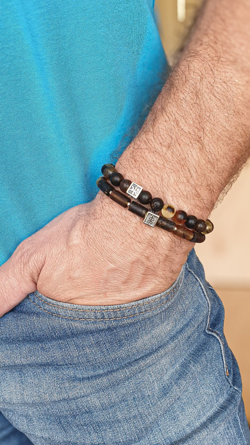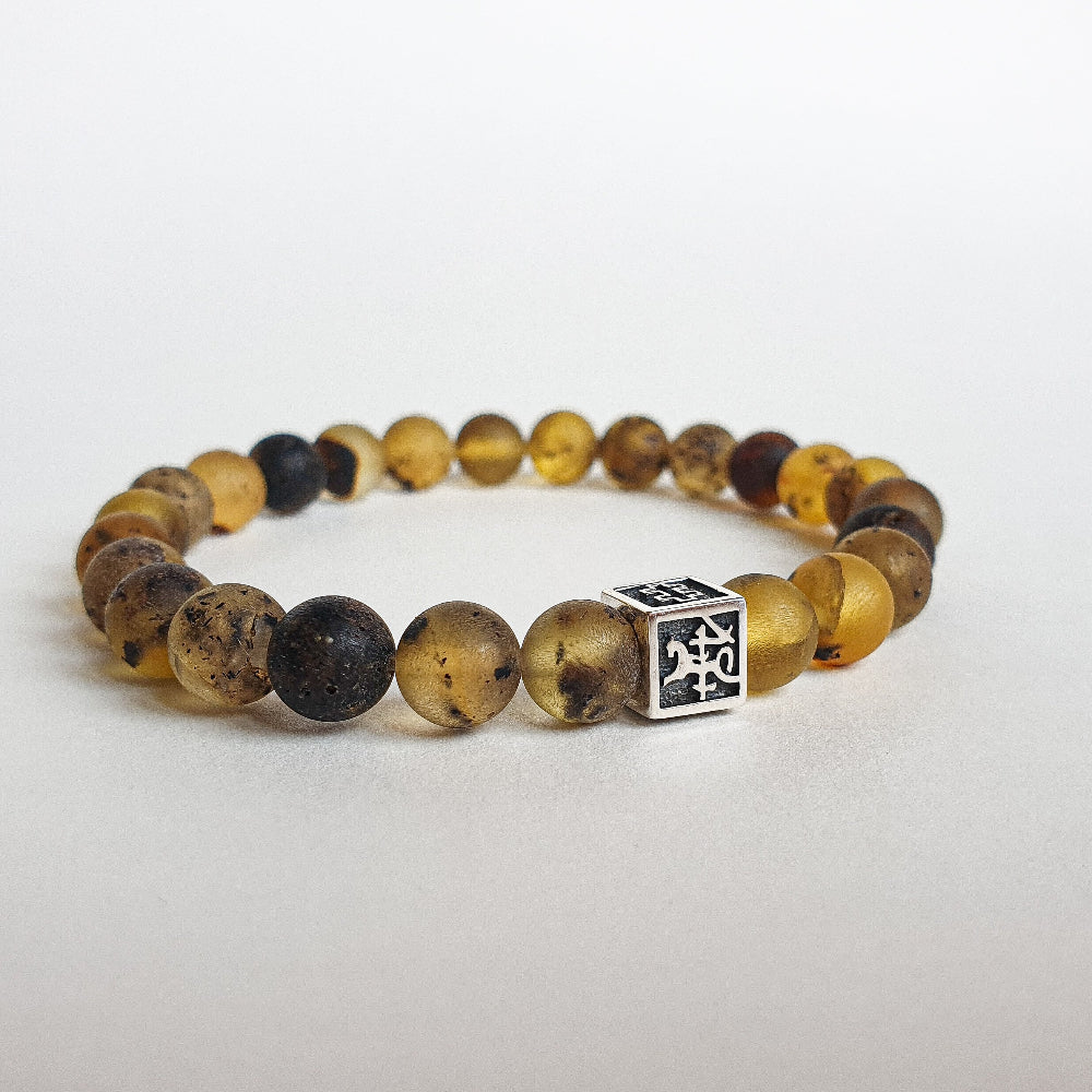 Bracelet for men and women with natural amber. It has an accent handcrafted charm “Vytis” made of 925 silver (~2,20 g). Amber diameter is 8 mm. Amber beads are strapped on strong, stretchy, long lasting 1 mm diameter cord. Jewelry is lovingly packaged in a gift box and comes with a list of amber qualities.