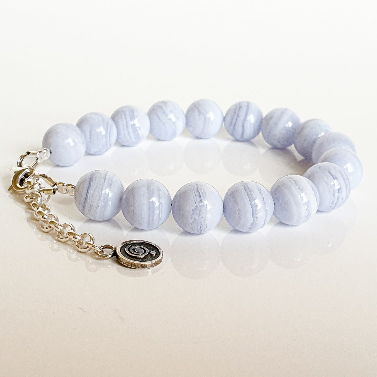 Bracelet for women with 10 mm natural Chalcedony beads. Subtle and calm, perfect for someone who longs for peace and wants to experience being “here and now”. Chalcedony works primarily with the mind and helps eliminate worries and concerns with ease and gentleness.