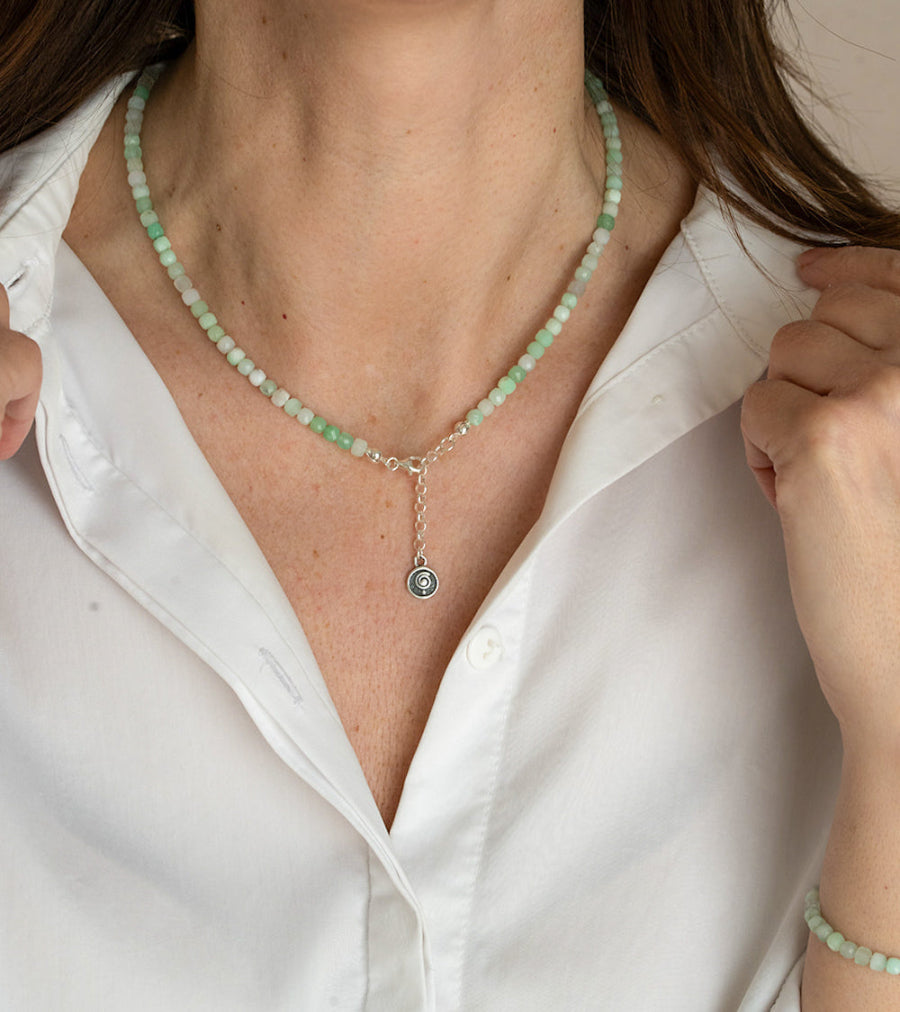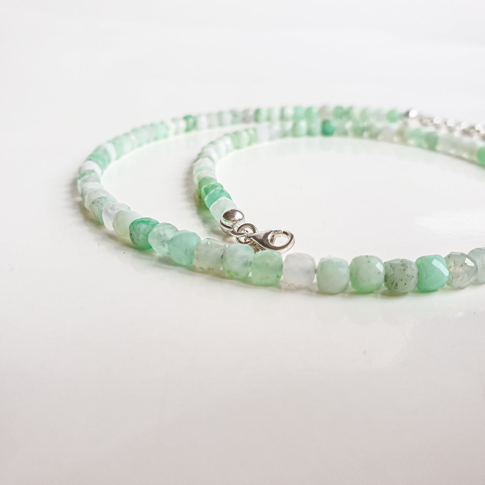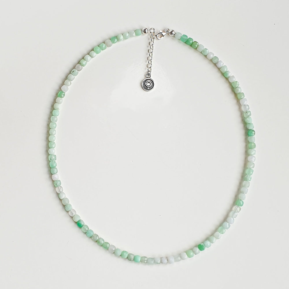 Necklace for women with natural chrysoprase. In mineralogy, chrysoprase is associated with the theme of harmony. It is believed that this green mineral helps align the physical body and subtle systems with the needs of the soul. In this way, a sense of inner security, authenticity, and harmony can be experienced.