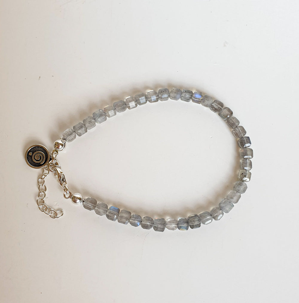 High quality labradorite beads are faceted cubes of size ~4,2 mm. Bracelet fits from S to XL wrist sizes.