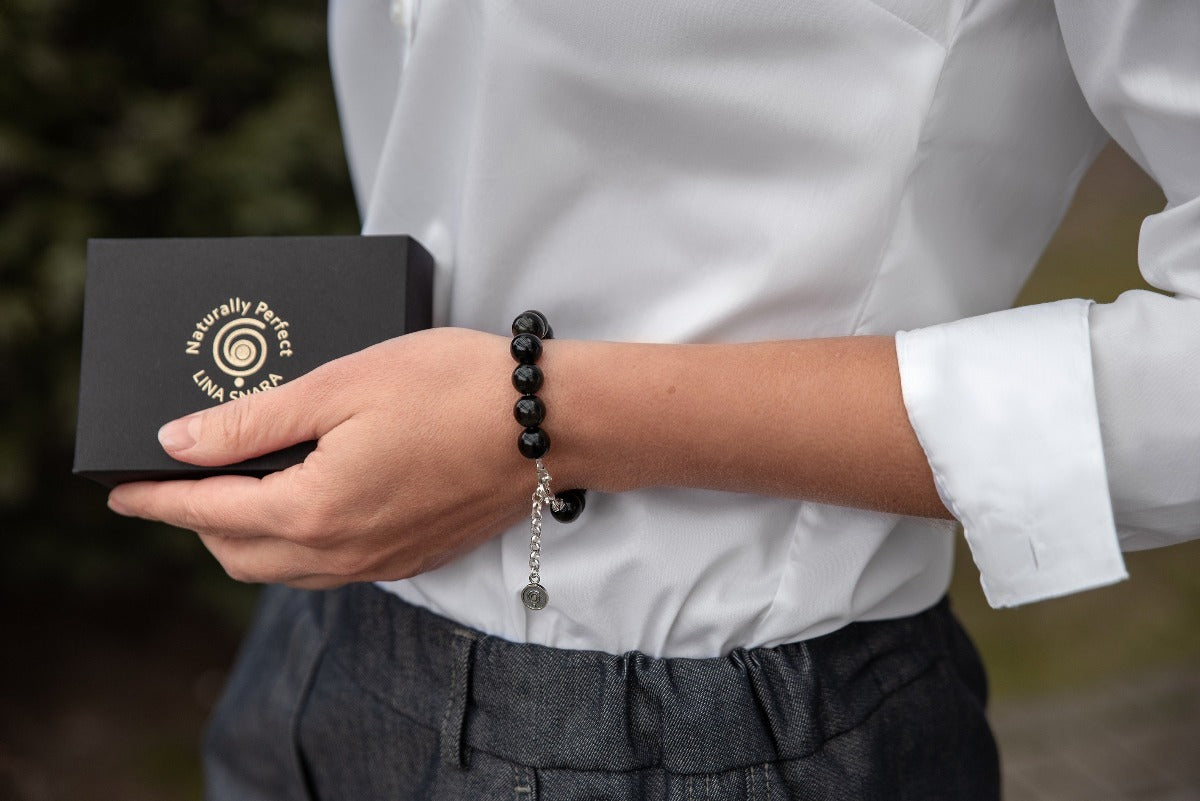 This bracelet for women with 10 mm natural Obsidian beads attracts success in activities, business, self-realization, growth, personal goals, inner strength and joy.